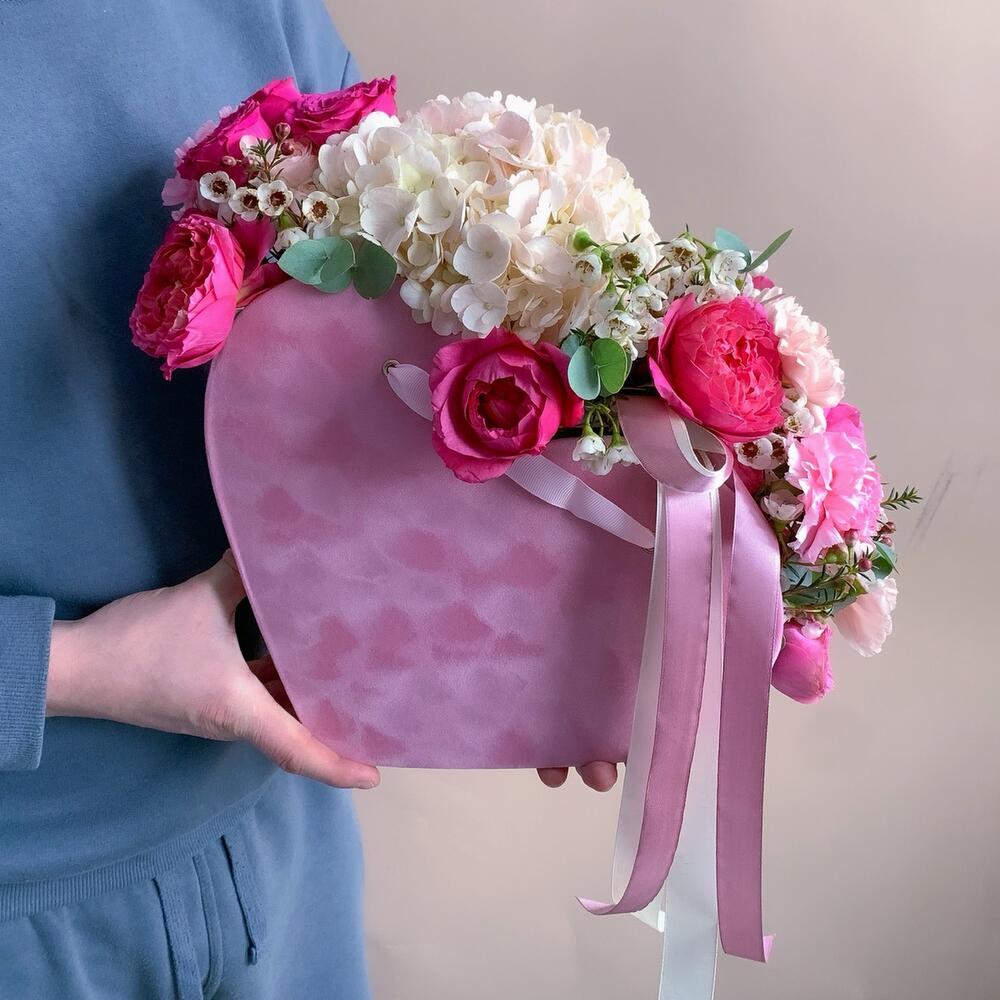 джульетта кустовая роза пионовидная – 2 шт.Кустовая роза пионовидная – 2 шт.Гвоздика сортовая – 4 шт.Хамелациум белый – 2 шт.Гортензия – 1 шт.Коробка сердце – 1 шт.Оазис флористический – 1 шт.