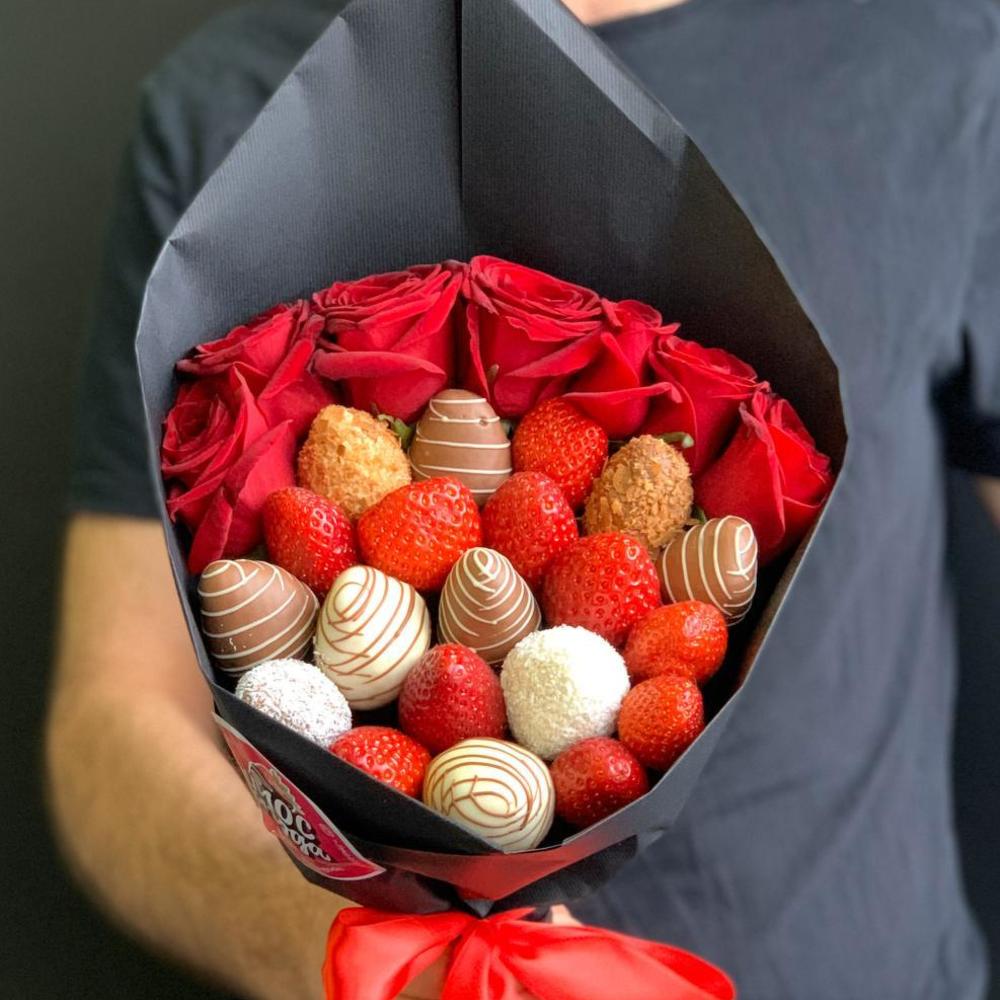Клубника – 8 шт.Клубника в шоколаде callebaut (бельгия) – 12 шт.Роза – 5 шт.