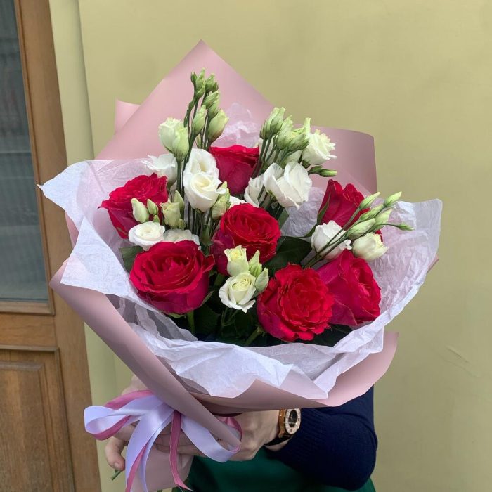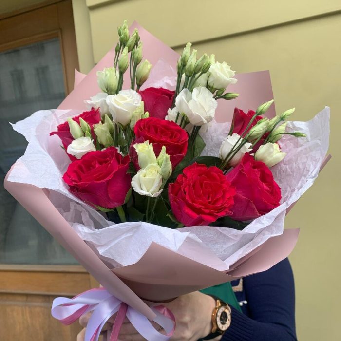 Эустома – 6 шт.Лента атласная – 2 шт.роза кения красная – 7 шт.Упаковка дизайнерская – 2 шт.