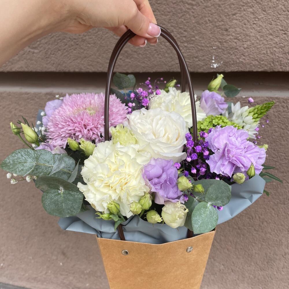 Роза пионовидная – 1 шт.Орнитогалум – 1 шт.Диантус – 4 шт.Эустома – 1 шт.Хризантема – 1 шт.Гипсофила – 1 шт.Эвкалипт – 1 шт.Фисташка – 1 шт.Оазис флористический – 1 шт.Упаковка – 1 шт.Сумка крафт – 1 шт.