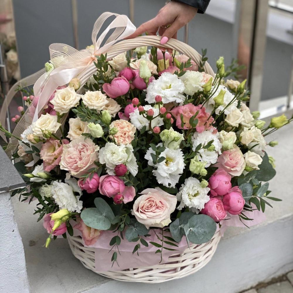 Эустома – 10 шт. роза розовая пинк мондиаль – 9 шт. Эвкалипт – 3 шт. Гиперикум – 5 шт. Гвоздика – 7 шт. кустовая роза таня – 5 шт. кустовая роза роял порцелина – 5 шт. кустовая пионовидная роза сильвия пинк – 8 шт. Корзина – 1 шт. Оазис – 6 шт. Оформление – 1 шт.