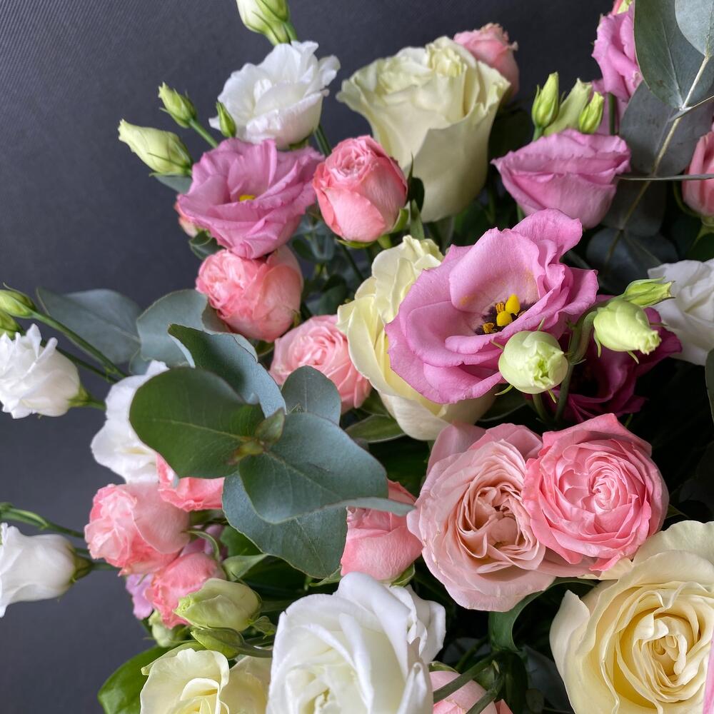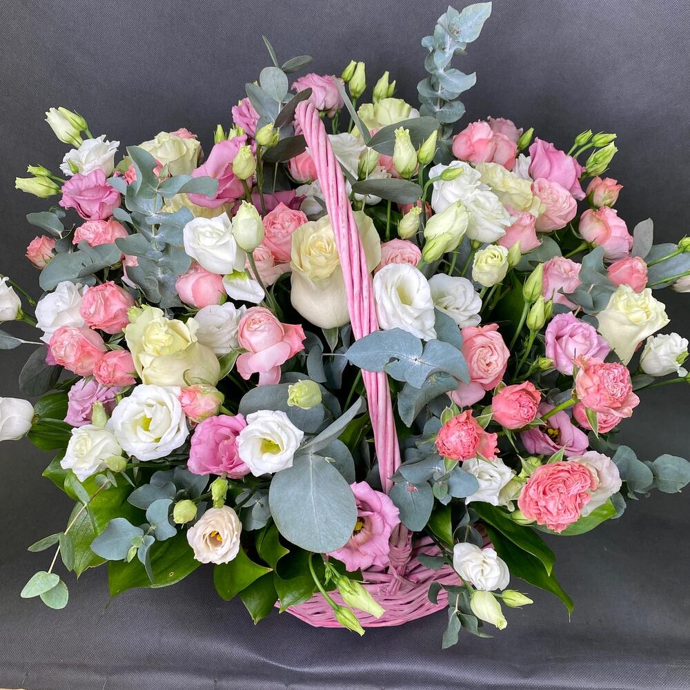Роза Эквадор – 7 шт.Роза кустовая пионовидная – 7 шт.Лизиантус – 7 шт.Рускус – 10 шт.эвкалипт ветка – 2 шт.Оазис флористический – 2 шт.Корзина большая – 1 шт.