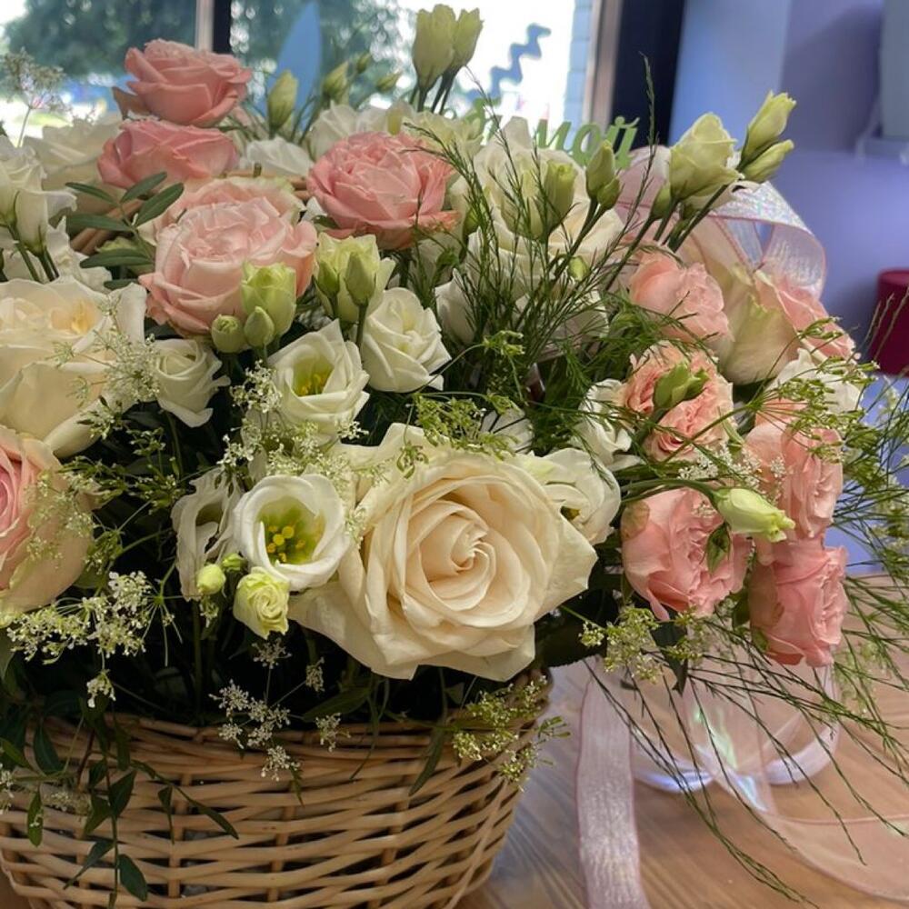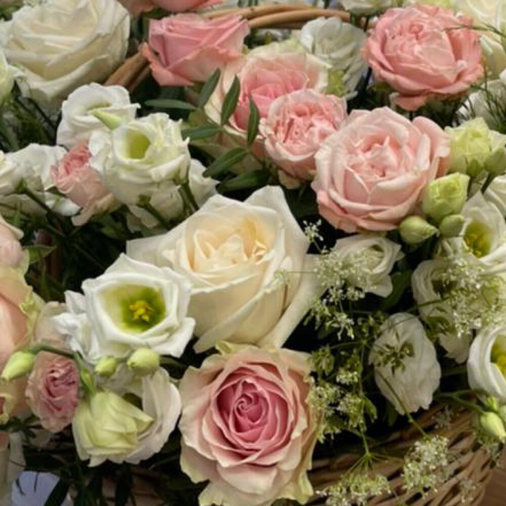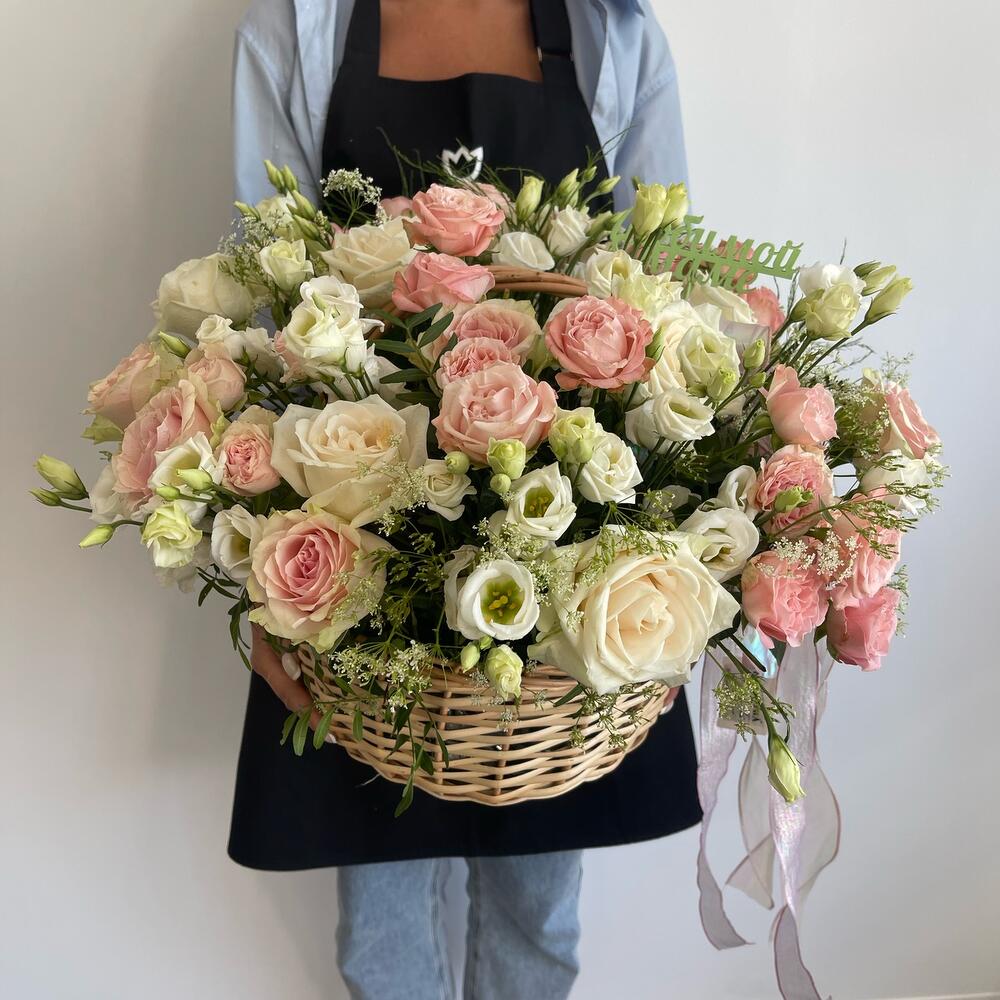 Корзина розами и эустомой