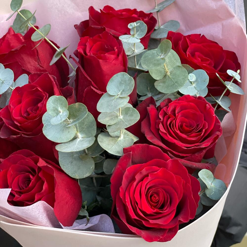 Эвкалипт – 3 шт.Роза Эквадор – 9 шт.Лента атласная – 1 шт.Тишью – 2 шт.Фоамиран (упаковка) – 1 шт.