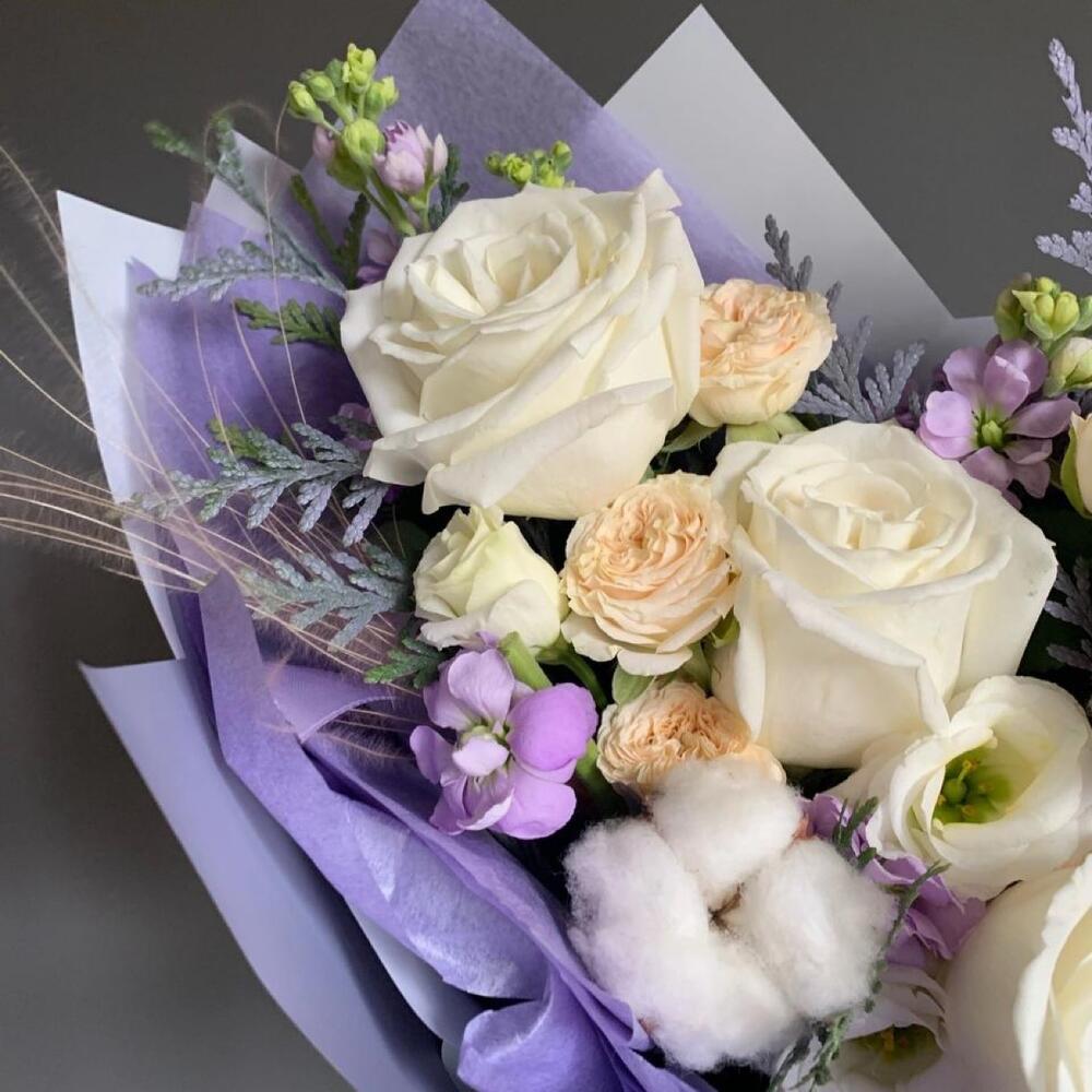 Пионовидная роза – 3 шт.Кустовая роза – 2 шт.Маттиола – 4 шт.Хлопок – 2 шт.Эустома – 2 шт.Упаковка дизайнерская – 1 шт.