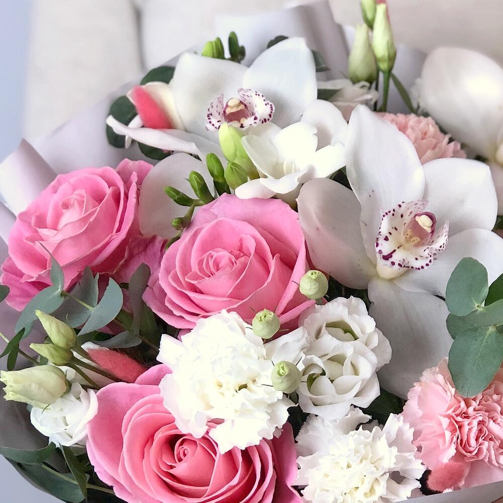 Роза Эквадор – 3 шт.Орхидея Цимбидиум – 3 шт.Фрезия – 3 шт.Диантус – 3 шт.Эвкалипт – 1 шт.Лагурус – 5 шт.Упаковка дизайнерская – 1 шт.