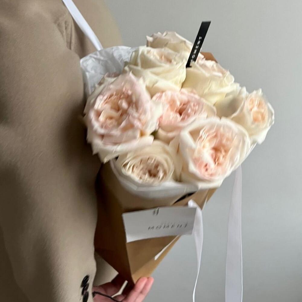 Букет роз сорта Охара, упакован в нежную тишью и крафтовую бумагу.Все наши букеты мы доставляем в фирменном оформлении. Пакет мы используем для комфортной транспортировки цветов, и это стало неотъемлемой частью нашего оригинального дизайна.Преимущественно, мы используем натуральные материалы для изготовления своих продуктов. Moment- eco friendly brand По желанию, подпишем карточку к вашему букету, укажите это в примечаниях.Ценность нашей работы в ваших лучших МОМЕНТах.