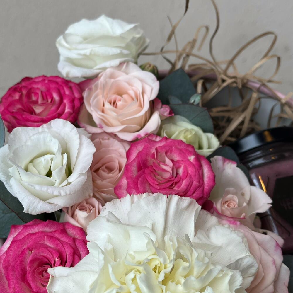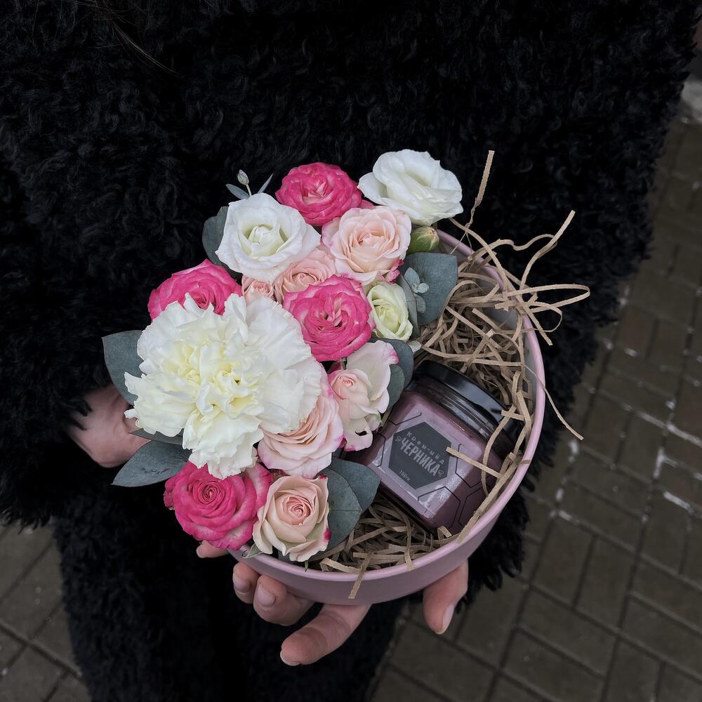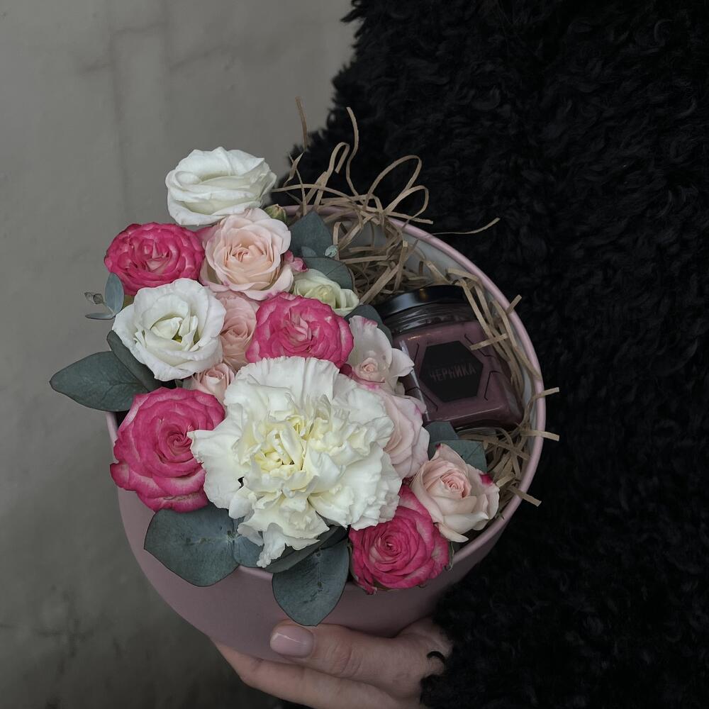 Романтичная коробочка со сладким крем-медом, кустовыми розами и диантусом.