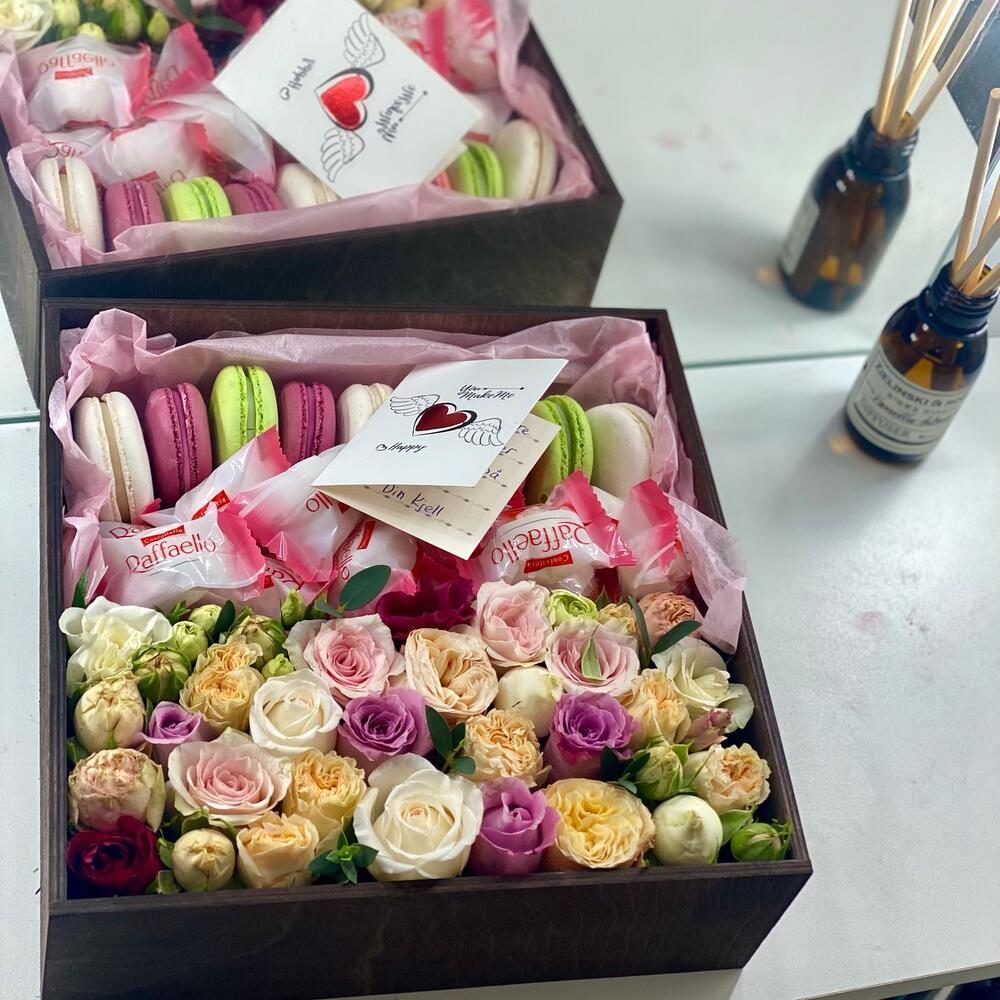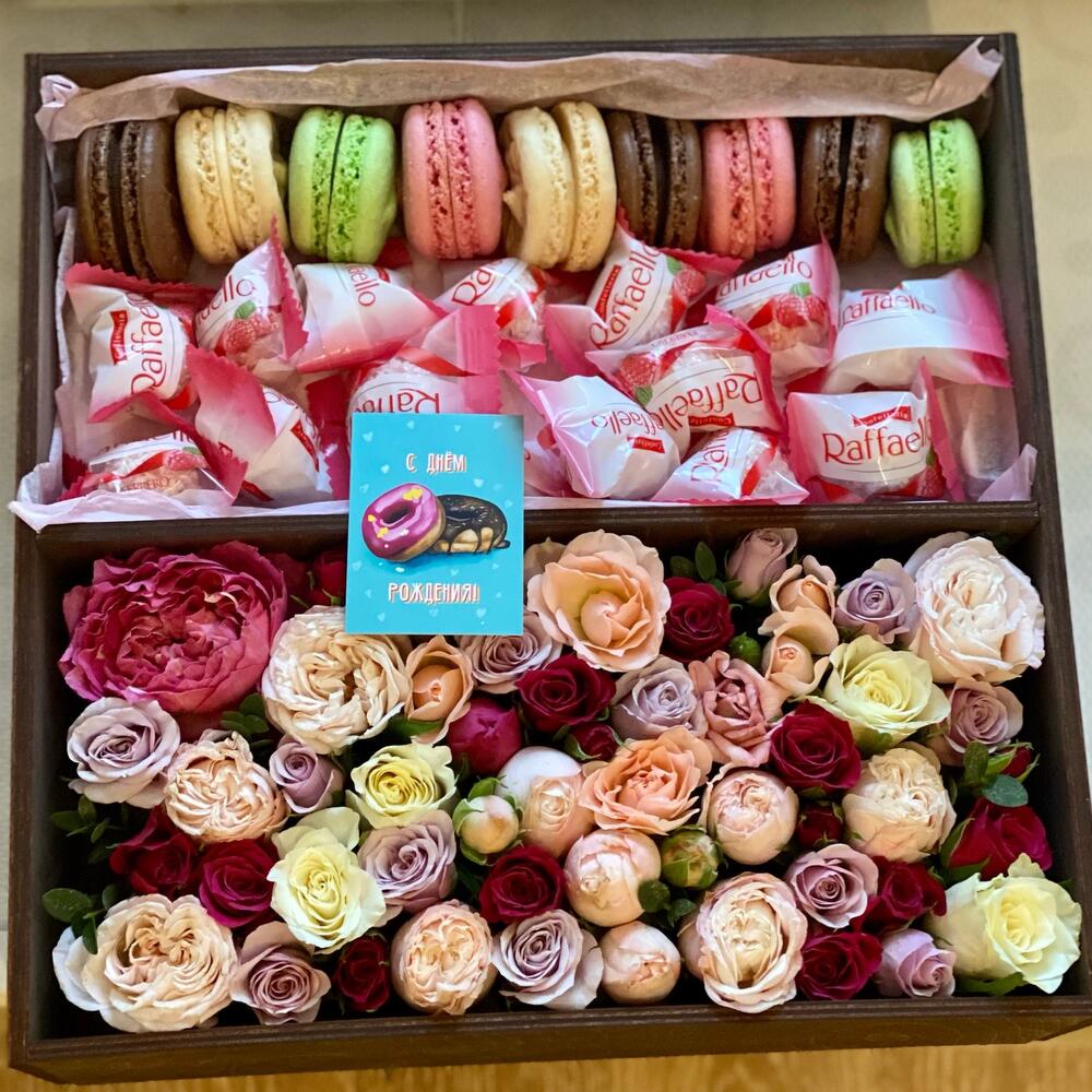 Роза кустовая пионовидная – 10 шт.Ящик деревянный – 1 шт.Оазис флористический – 2 шт.макарон (пирожное) – 9 шт.раффаэлло 150 гр – 1 шт.