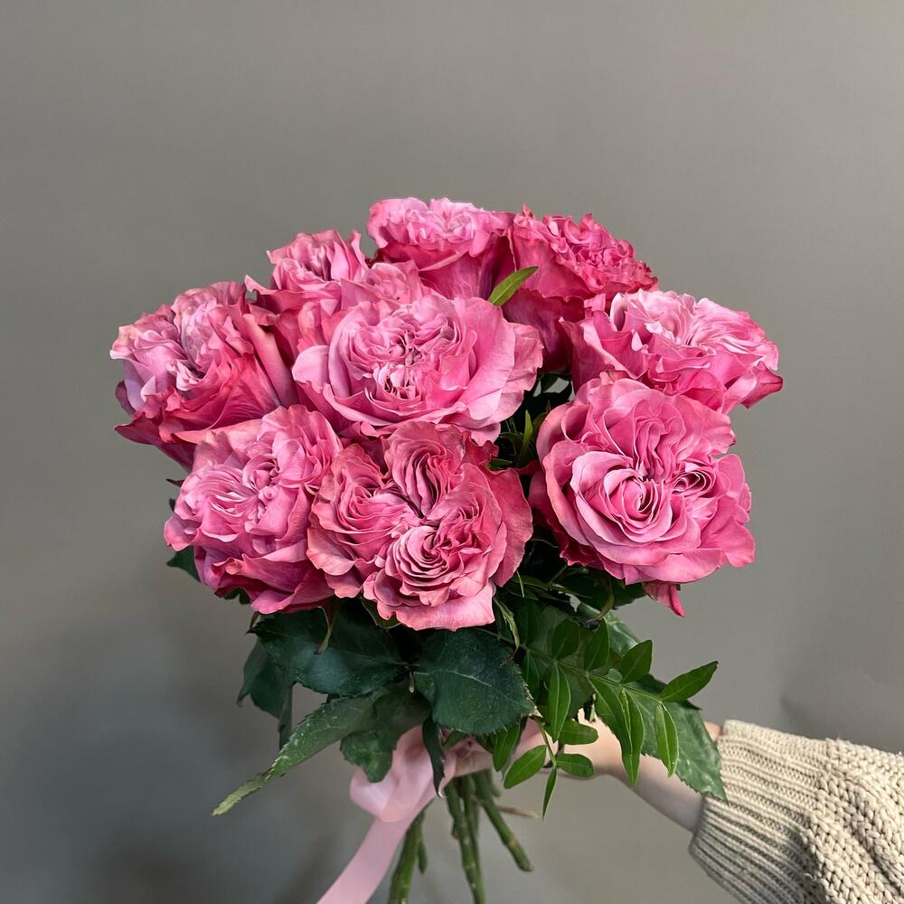 Локоничный и яркий букет из 9 пионовидных ягодных роз «Кантри блю». Интересный, сложный цвет роз делает их очень самодостаточными. Такие цветы не нуждаются в упаковке. Красивая лента создает нужный эффект