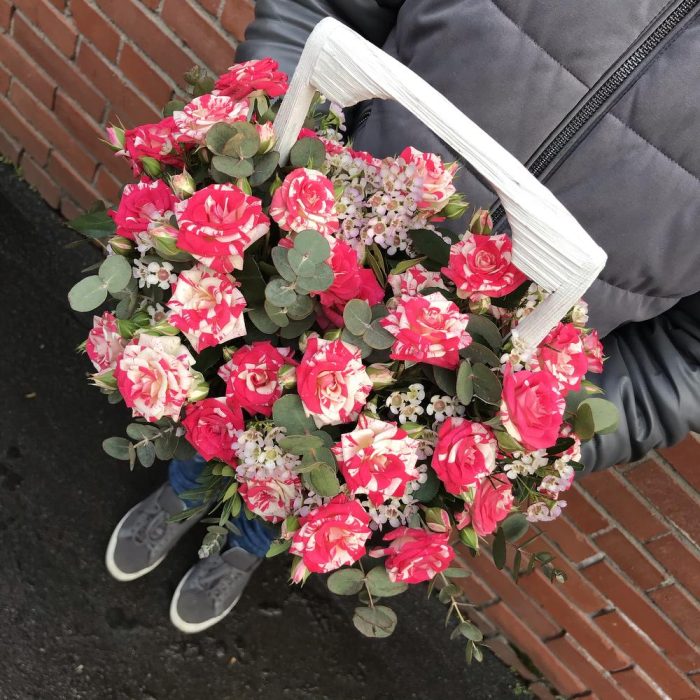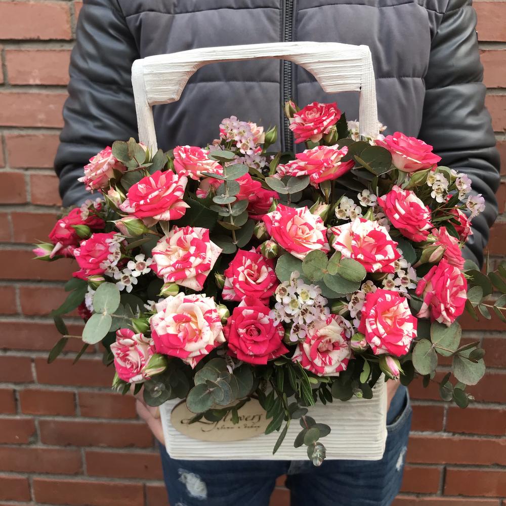 Яркие мраморные кустовые розы в стильном деревянном ящике ручной работы