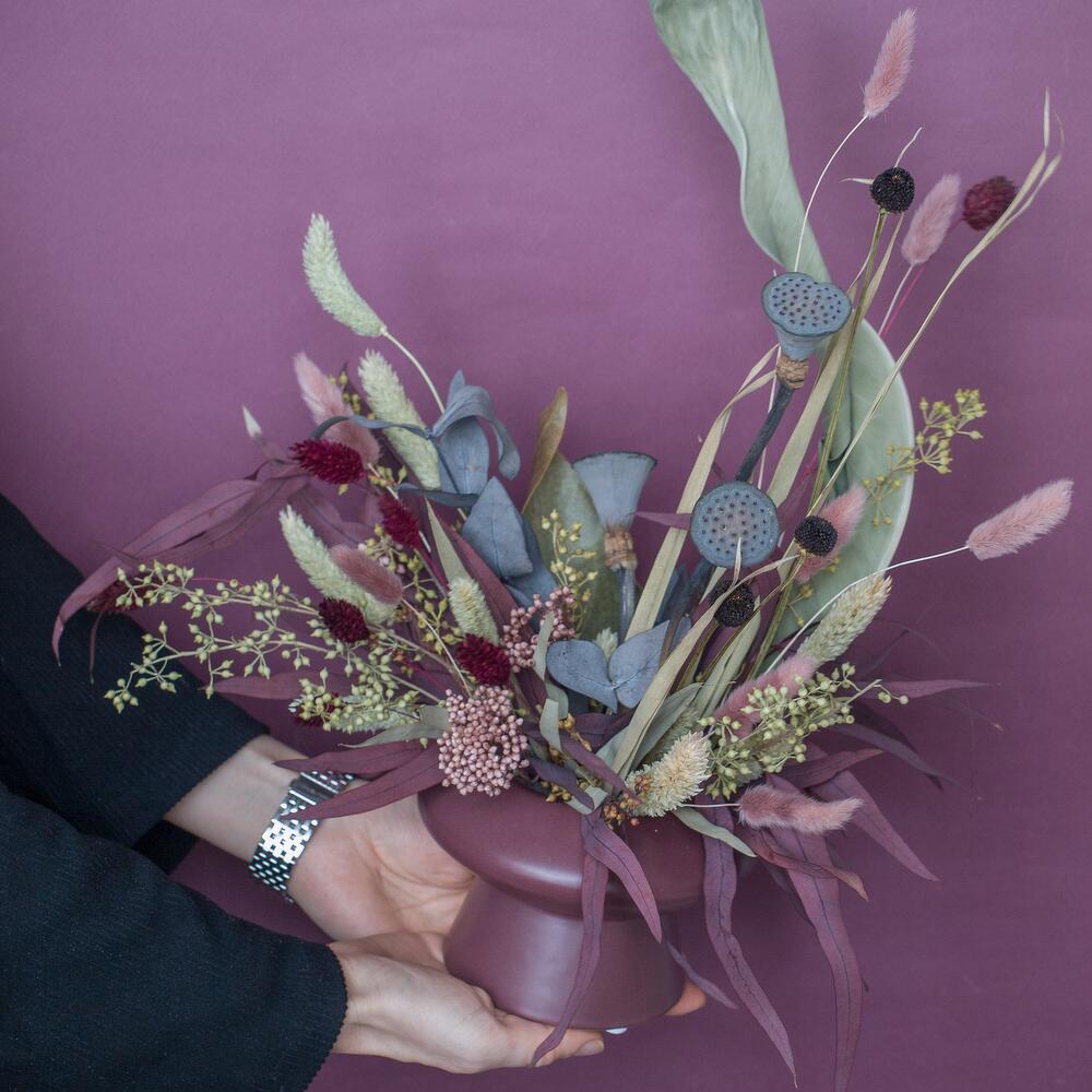 Интерьерная композиция из сухоцветов в розово-сиреневых тонах