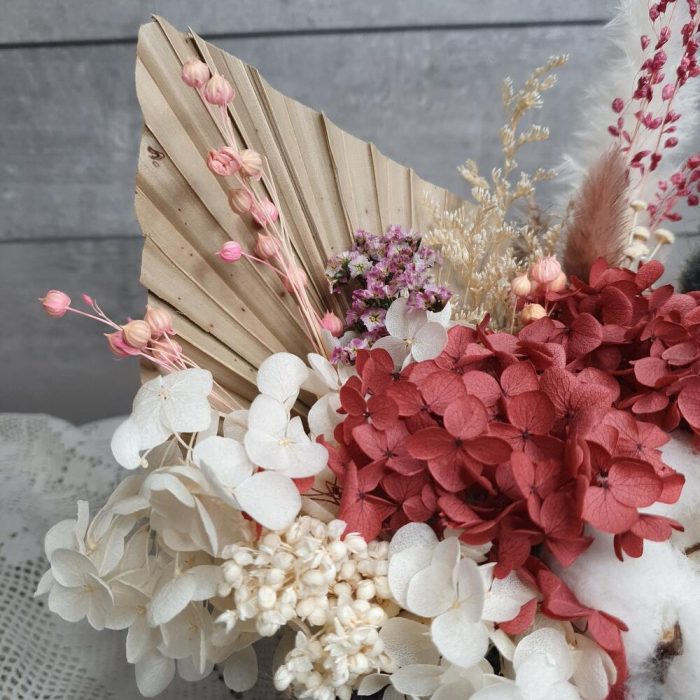 гортензия стабилизированная пучок – 2 шт.мини пампас – 2 шт.Лагурус (сухоцвет) – 5 шт.бриза пучок – 1 шт.Лен – 3 шт.амарант стабилизированный – 1 шт.копье пальмы – 1 шт.сорго – 1 шт.статица стабилизированная – 2 шт.Кермек – 2 шт.Хлопок натуральный – 1 шт.ботао – 6 шт.Кашпо керамическое – 1 шт.