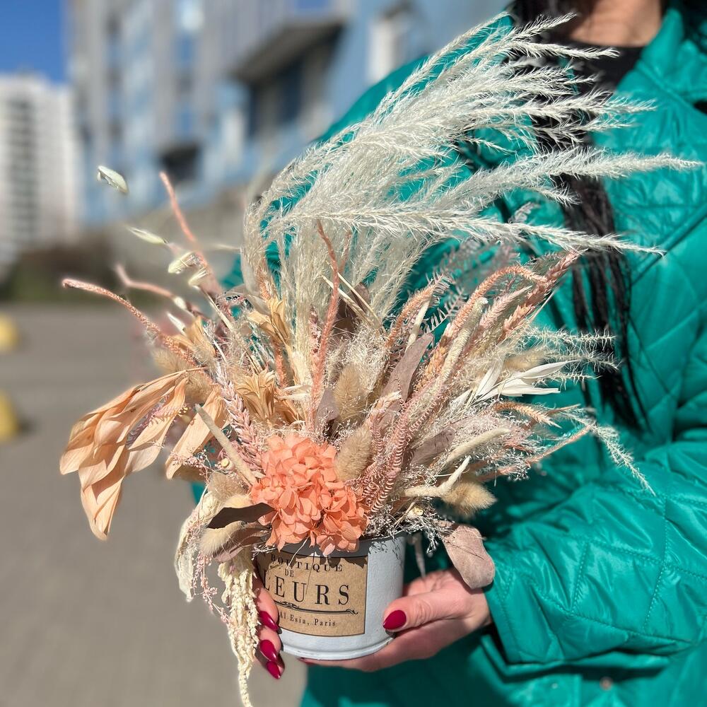 Гортензия – 1 шт.Пшеница – 3 шт.Оазис флористический – 1 шт.Кашпо жестянное – 1 шт.овес сухоцвет – 5 шт.кортадерия – 1 шт.амарант стабилизированный – 1 шт.мискантус белый – 5 шт.