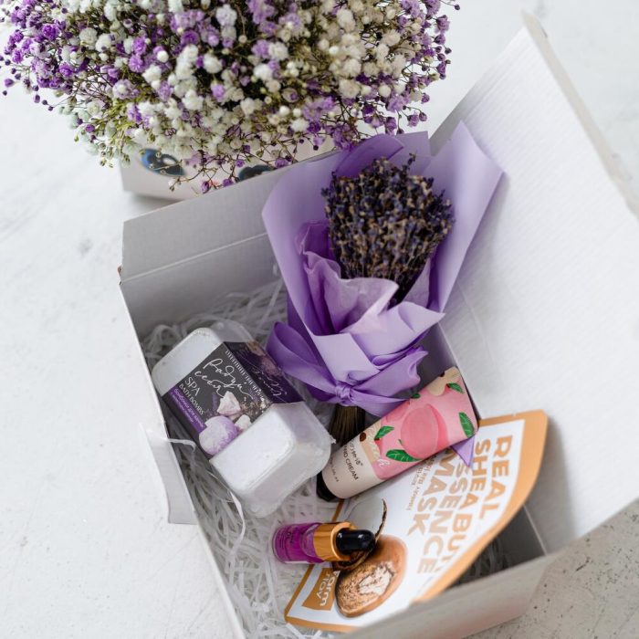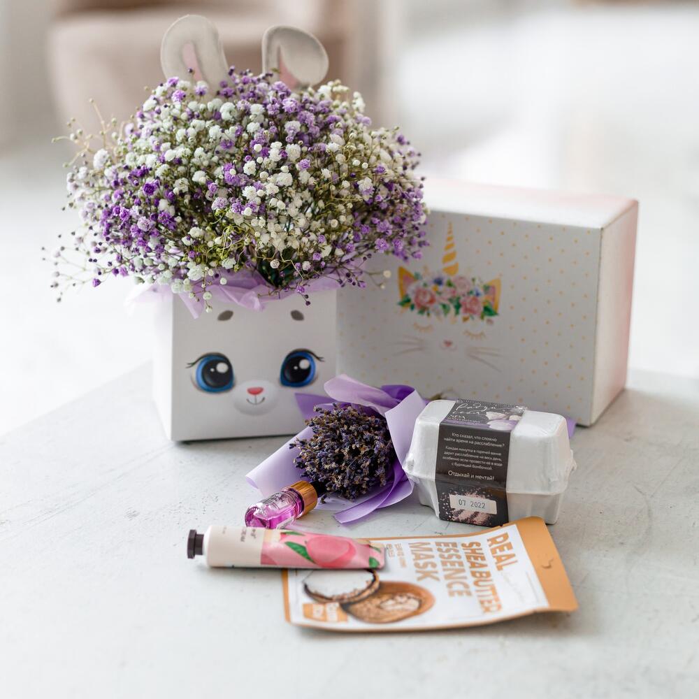 Гипсофила – 5 шт.коробка зайка – 1 шт.Тишью – 4 шт.Оазис флористический – 1 шт.маска для лица корея farm stay – 1 шт.Крем для рук – 1 шт.масло для кутикулы – 1 шт.бомбочки для ванной набор – 1 шт.Коробка подарочная – 1 шт.Наполнитель бумажный – 1 шт.Лента атласная – 1 шт.Упаковка транспортировочная пленка – 1 шт.инструкция по уходу за цветами – 1 шт.букет лаванда – 1 шт.