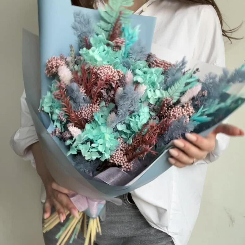 Лаванда – 13 шт.Лимониум – 2 шт.Озотамнус – 2 шт.Аспарагус – 1 шт.Упаковка дизайнерская – 1 шт.Овес – 5 шт.чайное дерево – 2 шт.гортензия стабилизированная – 1 шт.пароротник – 1 шт.Фаларис – 11 шт.